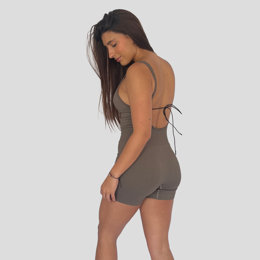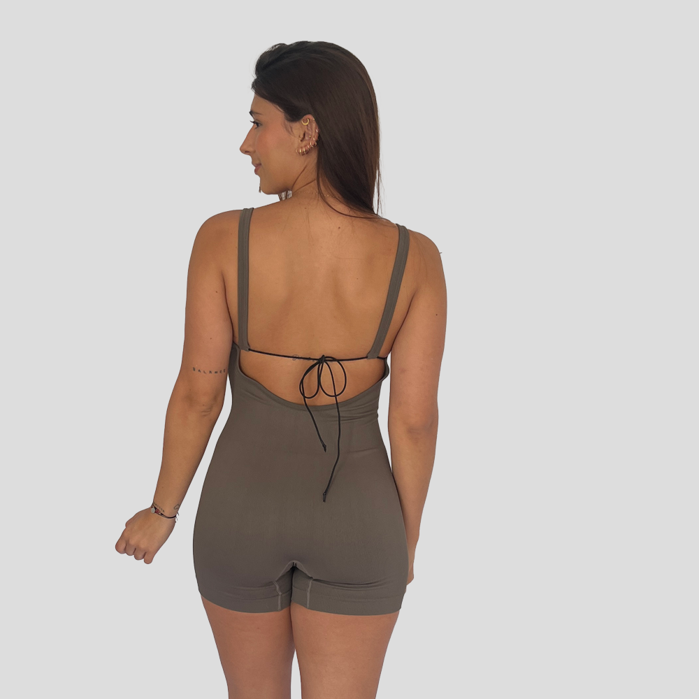 Enterizo deportivo para mujer en short con pretina superior doble con tecnología de compresión que permite mejor soporte en la parte del abdomen y realce de glúteos. Escote en la espalda ajustable.