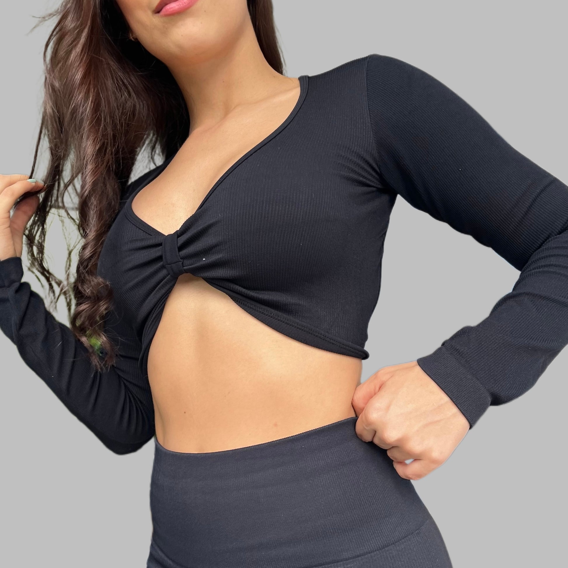 Top buzo deportivo para mujer, con textura en rib, con un muy buen soporte, con espalda descubierta lo que lo hace una prenda muy versátil. Leggings deportivo con pretina superior doble con tecnología de compresión que permite mejor soporte en la parte del abdomen y realce de glúteos. El grosor de su tela brinda seguridad y compresión, no transparenta y te hará sentir con estilo y cómoda en tus rutinas de ejercicio.